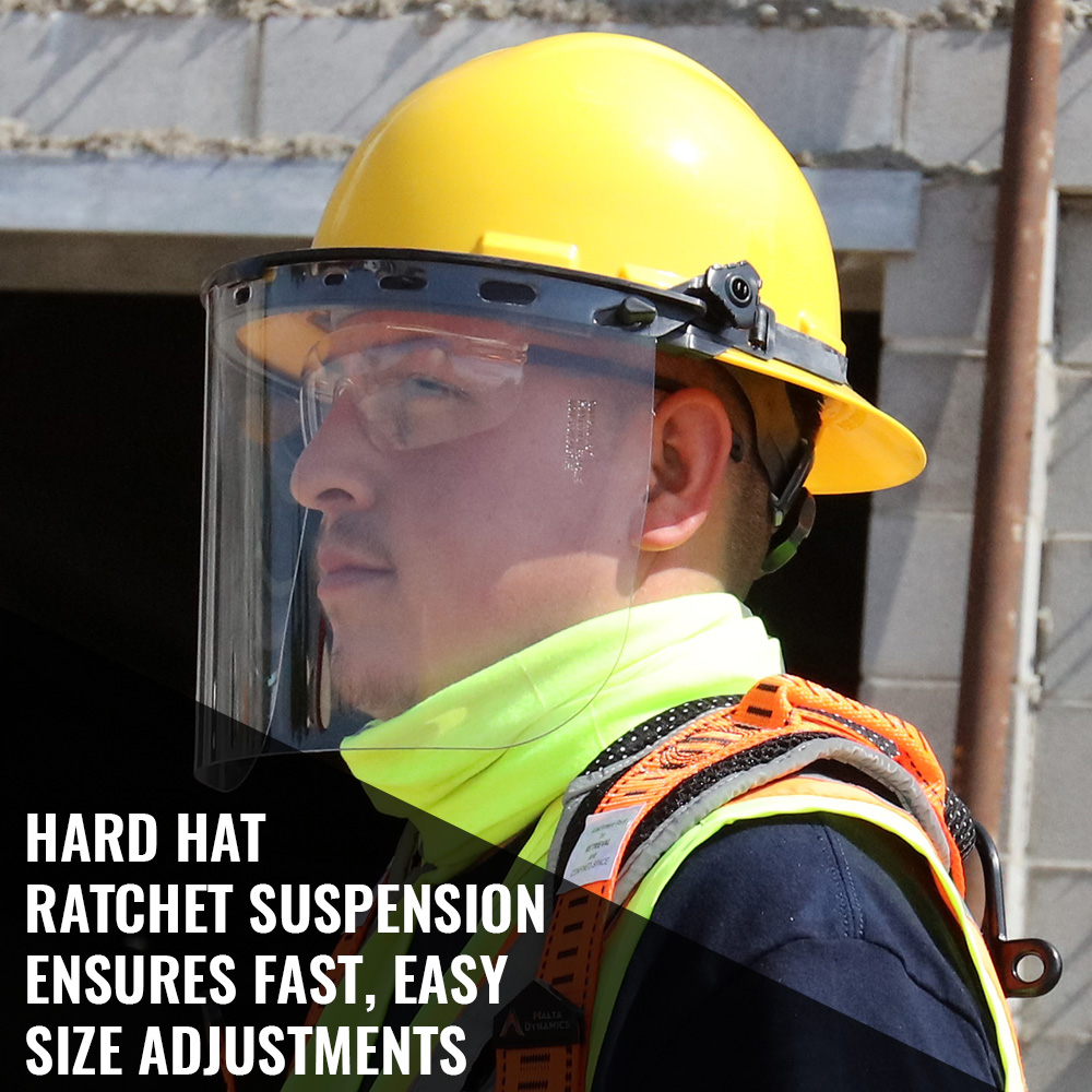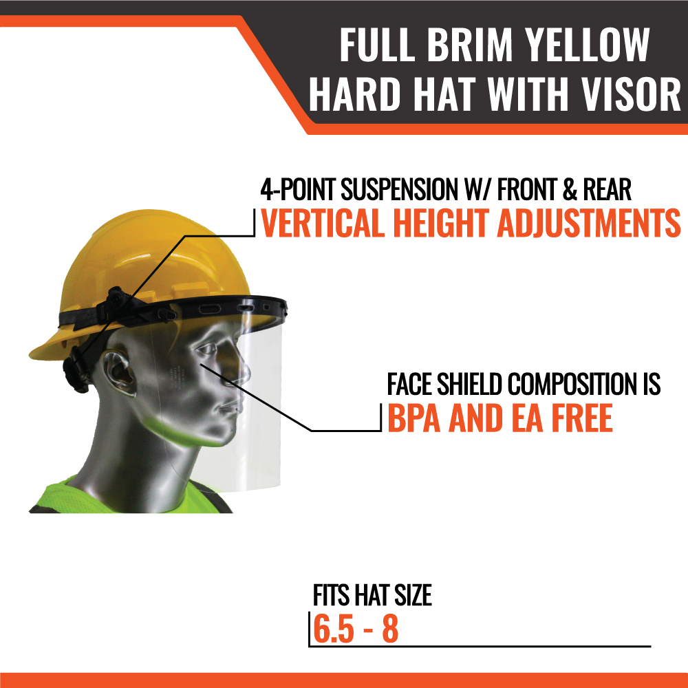 Malta Dynamics has put together a hard hat visor kit that is designed to give full protection for both your head and face at the same time. This kit includes one of our fan favorites, a 4 Pt. Ratchet Full Brim Style Hard Hat, and a full face visor with a bracket for attachment to the hard hat. The standard hard hat with a full brim features a poly brow pad and four points of attachment for a more secure fit. The full brim on the hat protects against splash, glare, and sun exposure, while the ratchet system allows for a snug and comfortable custom fit.